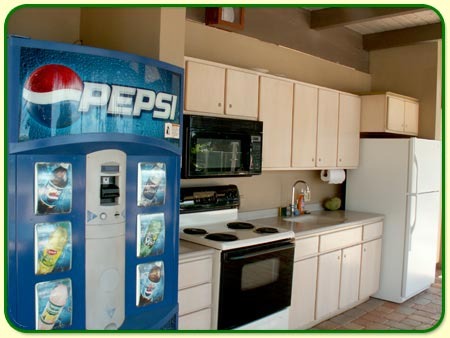 The Kitchen area has tables, ovens, range, sink, fridge and plenty of counter space for food preparation, cleanup, and convenience. Large tables are available for your picnics.